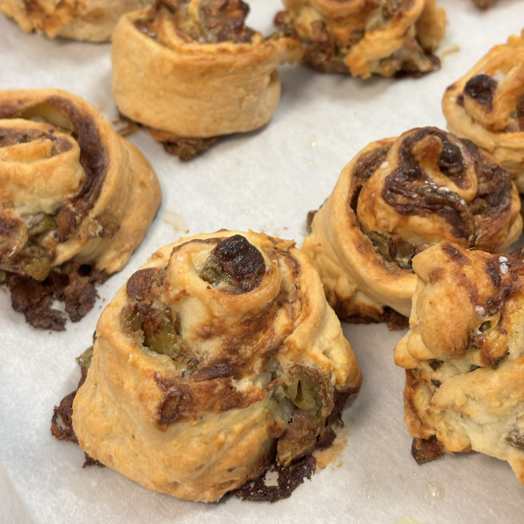 For this recipe, I’ve altered the normal ratios of our classic Buttermilk Biscuit dough to make a sturdier dough that can be rolled thin. I also used my go-to olive-stuffing mixture for the blue cheese filling, along with a generous amount of chopped olives. These pinwheels can be made to a larger size as part of a brunch or lunch, or made into bite-size appetizers for your cocktail parties and happy hours.