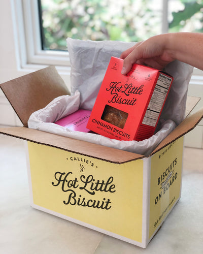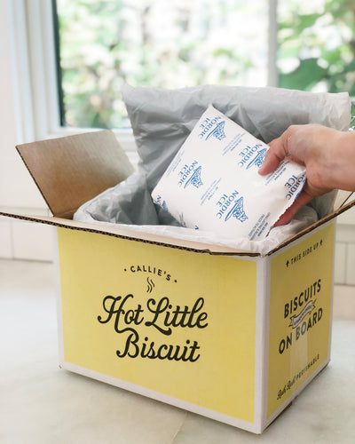 We ship all of our perishable items in insulated boxes with frozen gel packs. Shipping cost are based on the amount of product, weight of box, and transit time due to perishable items needing to arrive quickly. It is the responsibility of the purchaser to make sure the recipient's shipping address is correct and available for delivery. We cannot ship to a PO Box. Callie's Hot Little Biscuit is not responsible for delays in transit caused by high package volume, weather, mechanical error, strikes, natural disasters, terrorism safety control, local carrier mis-scans or inaccurate/incomplete shipping information.