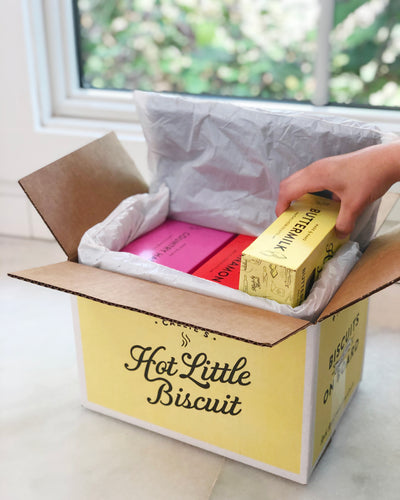A hand-packed box of biscuits will arrive on your doorstep fully baked, and ready to be reheated or placed in the freezer. Please note, your perishable order will arrive cool to the touch and not necessarily frozen. Our biscuits are fully baked before we freeze them, so they will not spoil. You can re-freeze the biscuits and cookies. Promptly put pimento cheese in the refrigerator upon arrival.